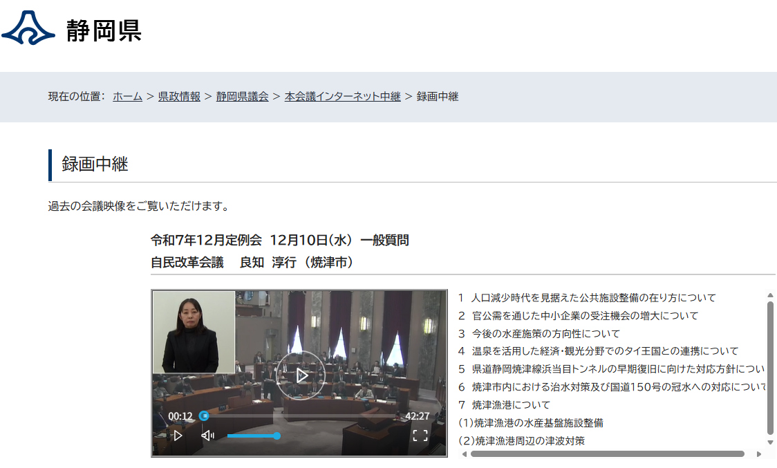 令和7年12月10日の静岡県議会定例会で、焼津市選出の良知淳行議員が