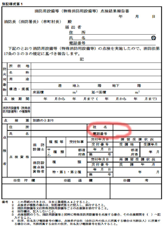 平成26年4月14日付け消防庁告示第14号により、下記に掲載した「消防用設備等(特殊消防用設備等)点検結果報告書」別記様式第1においては新たに「点検者社名及び電話番号」記載欄が、また別記様式第3においては「点検者社名」欄が追加されました。丸(○)で囲んだ部分です。静岡県消防設備保守点検業協同組合(以下「当組合」という)としては、消防法の中に「会社(事業者)」の存在が位置づけられたものと理解しています。