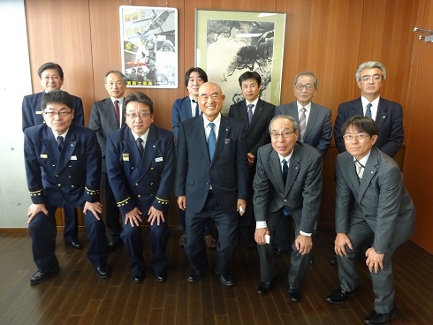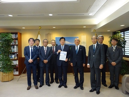 ・平成31年1月8日(火)午前、静岡県庁東館に川勝知事を新年挨拶のため組合役員が訪れました。西川理事長による組合活動の概況・共同受注結果報告に、川勝知事から力強い励ましのお言葉をいただくことができました。