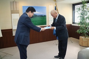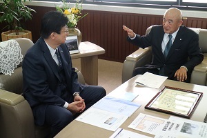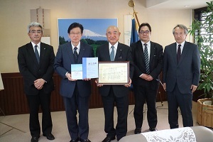・ 西川理事長ほか組合役員は、令和2年3月26日(木)午後、静岡県庁の知事室を訪問し約30分、県経済産業部の部長代理、担当課長、県中小企業団体中央会の指導部長さん同席のもと、一般財団法人商工総合研究所実施「第23回中小企業組織活動懸賞レポート(全国)」での本賞受賞を川勝県知事に報告しました。
