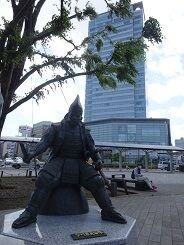 ・ 閑話休題。写真は、総会前日に除幕式(川勝県知事も参加)の行われたJR静岡駅北口の今川義元公の銅像です。今川義元公は、「東海道一の弓取り」と言われ令和2年(2020年)が生誕500年。写真では組合の通常総会を見守るかのように、銅像の背中越しに総会会場がそびえ立っています。