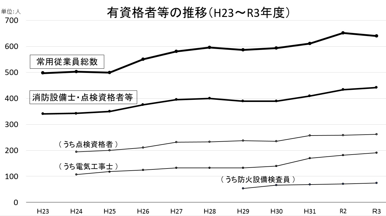 ・ 当組合が、独自に毎年実施している「組合員の資格者等調査」の集計結果(令和3年4月末)がまとまりました。調査結果は、当組合全体の常用従業員は640人、消防設備士等441人、電気工事士191人、防火設備検査員74人(いずれも実人数)でした。グラフ(下図)のとおり、有資格者は確実に増えています。