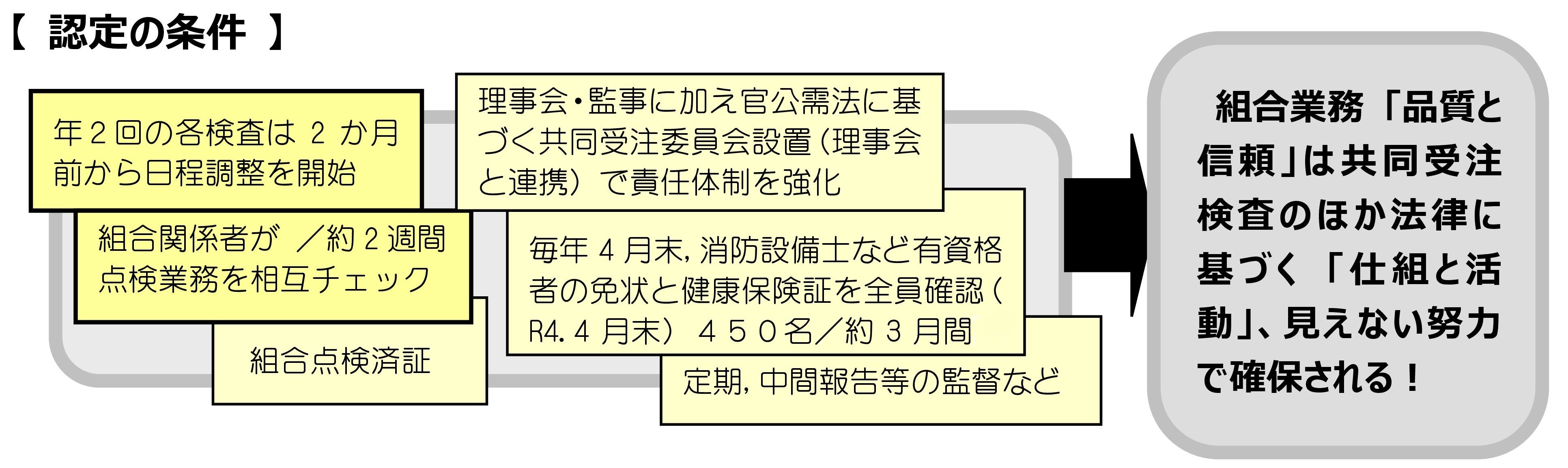 〇 小田巻検査員長は、令和4年度共同受注検査・前期の完了に当たり「概ね良好。引き続き緊張感を持って適正点検を遂行されたい」と、総括しました。下記スキーム図は、官公需法(官公需適格組合)における「共同受注検査の位置づけ」。官公需適格組合は、これら全てのもので成り立っています。