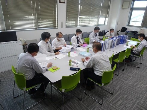 ◯ 官公需適格組合の認定条件(中小企業庁)である「共同受注検査」。年2回のうち前期検査は、共同受注した全物件の書類検査です。令和4年度は、検査員6名(理事長が理事会の同意を得て任命・2名1組で活動)と組合員(幹事会社)実務担当者10名、それに組合事務局長が加わって共同受注関係の全書類を相互確認。