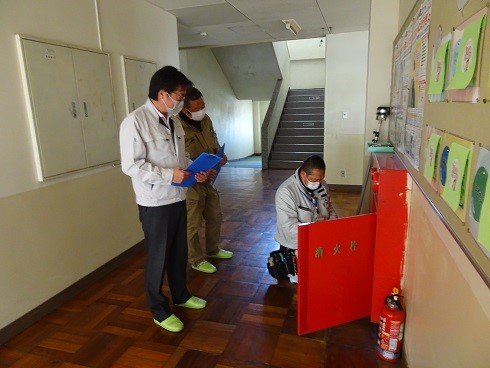 ・組合の検査員6名が2名・1班で点検現場に出向き、@点検従事者の資格者証を確認、A試験器具等「校正(定期的な機能確認)」状況をチェック、B点検作業・項目を現場確認、さらにC発注側の事務担当者に「協同組合の活動報告(組合事務局の同行者)」を行います。