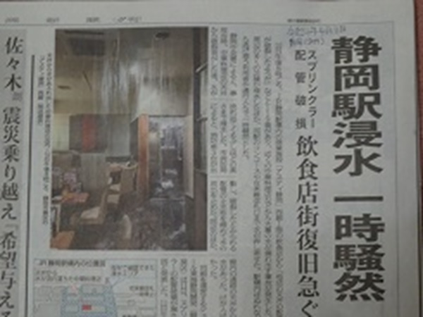 日ごろは、多くの人で賑わう店舗や周辺は、設備復旧のために休業(最大で36店舗という報道)する店舗もあり、余り馴染みのない消防設備関連のトラブルに驚きを隠せません(静岡新聞記事、組合事務局4月14日撮影)。基本的なことですが、消防用設備等点検報告など設備の維持管理、それを実施する信頼できる業者及び有資格者(消防設備士や点検資格者等)の重要性を再認識させる出来事でした。