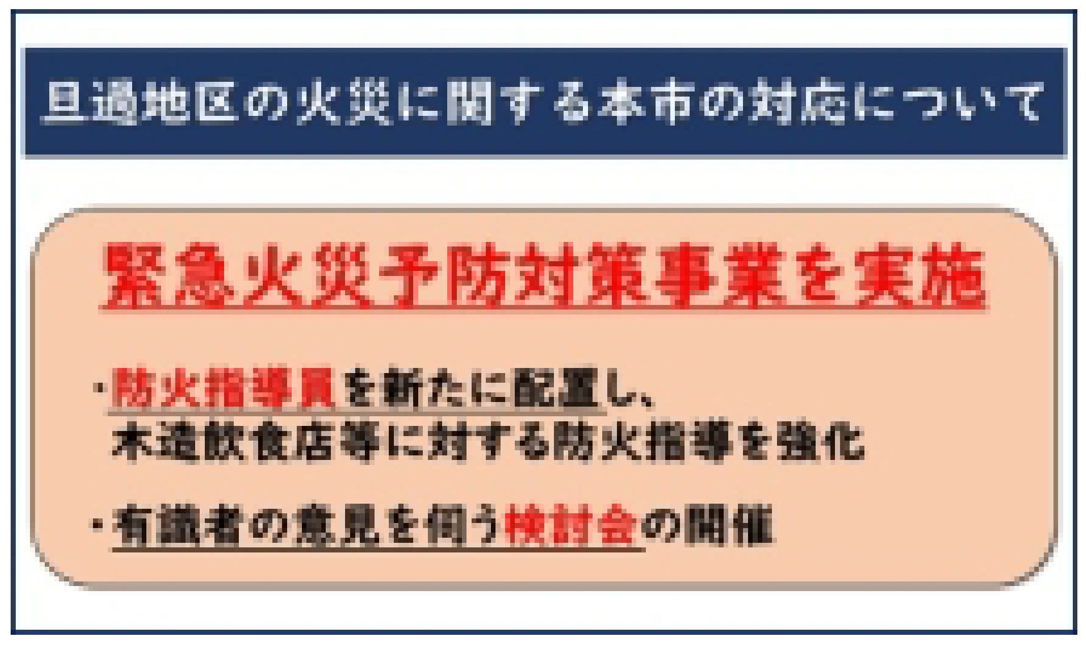 そこで、防火指導員を新たに14名配置いたしまして、火災発生や延焼リスクの高い木造飲食店など、市内約650軒を対象にした防火指導の強化を行います。加えまして、今後の火災予防対策のあり方をいろいろと検討するため、有識者の意見を伺う検討会を開催することにいたします。これらに関する補正予算案を9月議会に提出いたします。