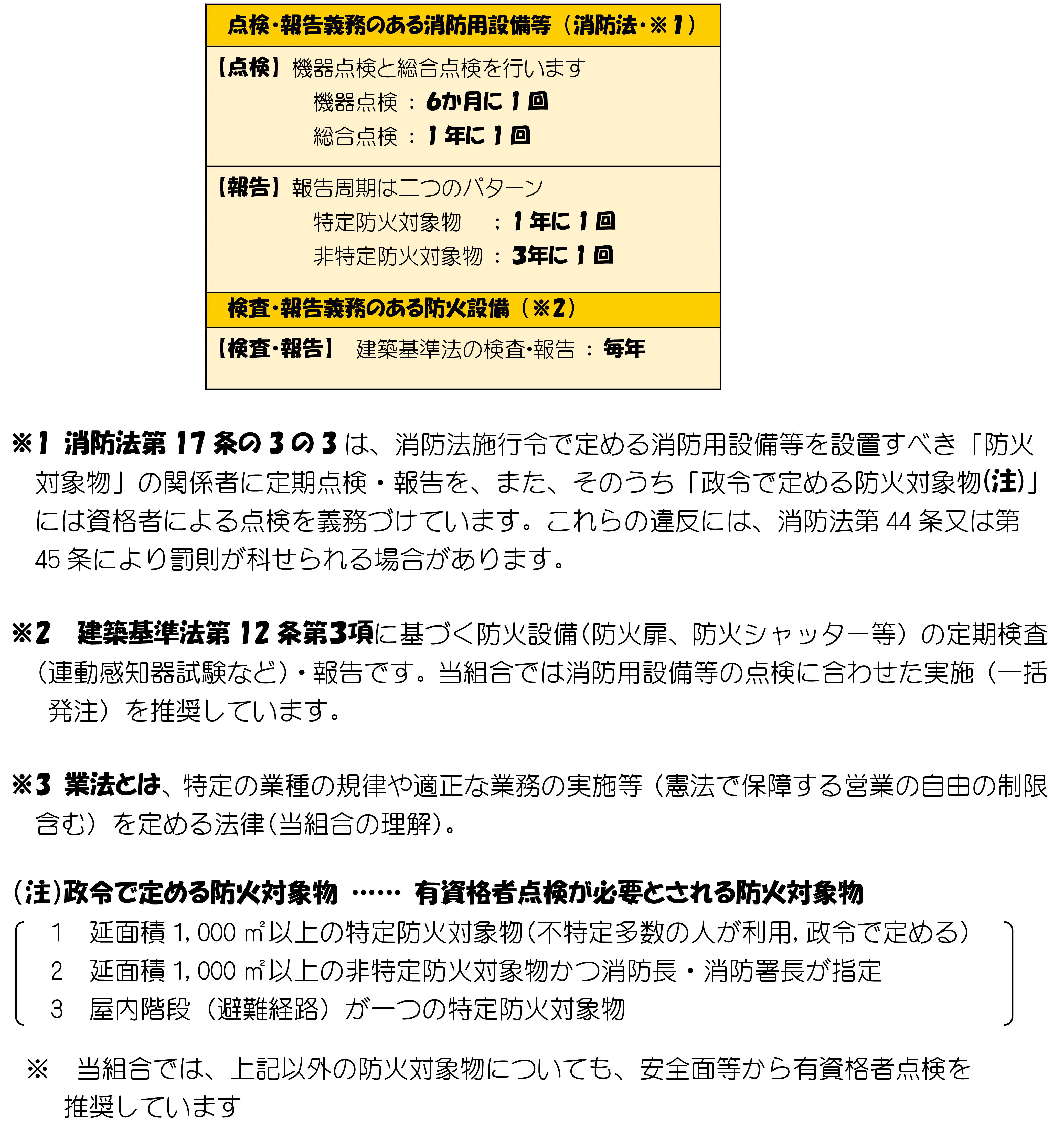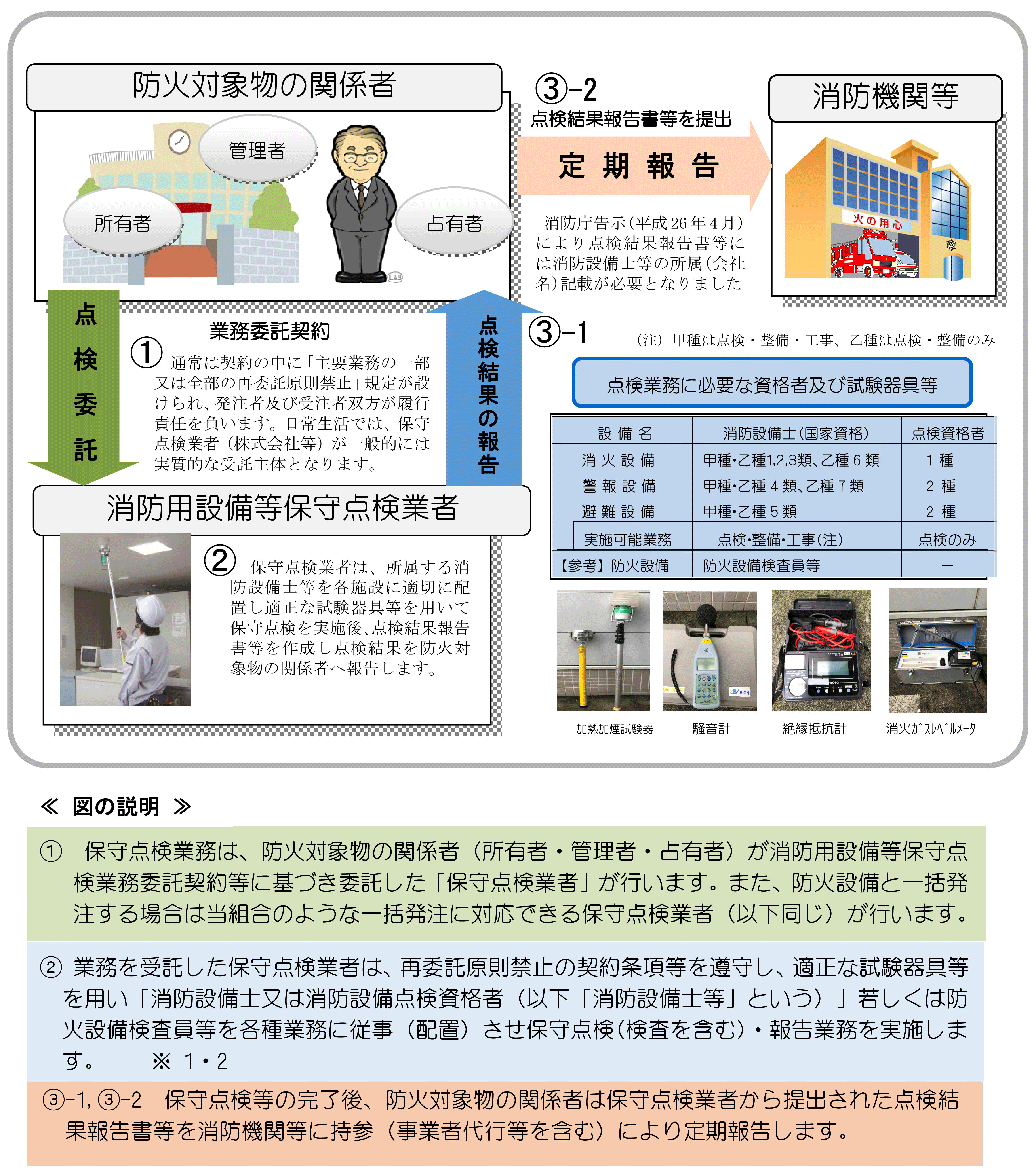 消防法のルール 消防法は、消防法施行令で定める消防用設備等を設置すべき防火対象物の関係者(建築物の所有者など)に「消防用設備等の定期点検」と「点検結果の報告」を義務づけています(※1)。また、定期点検を義務づけた防火対象物について、「(1)その用途や規模等(政令の定め)に応じて消防設備士等に点検させ、(2)前項(1)以外にあっては(防火対象物の関係者)自らが点検し」、その点検結果を消防長又は消防署長に報告しなければならないと定めています。このように、消防法第17条の3の3では「消防設備士等に点検させ」と記述されていますが、日々の日常生活では防火対象物の関係者は「保守点検業者(消防設備士等を雇用等し、かつ消防法等が定める適正な試験器具等を有する業者)」に点検委託するのが一般的です。