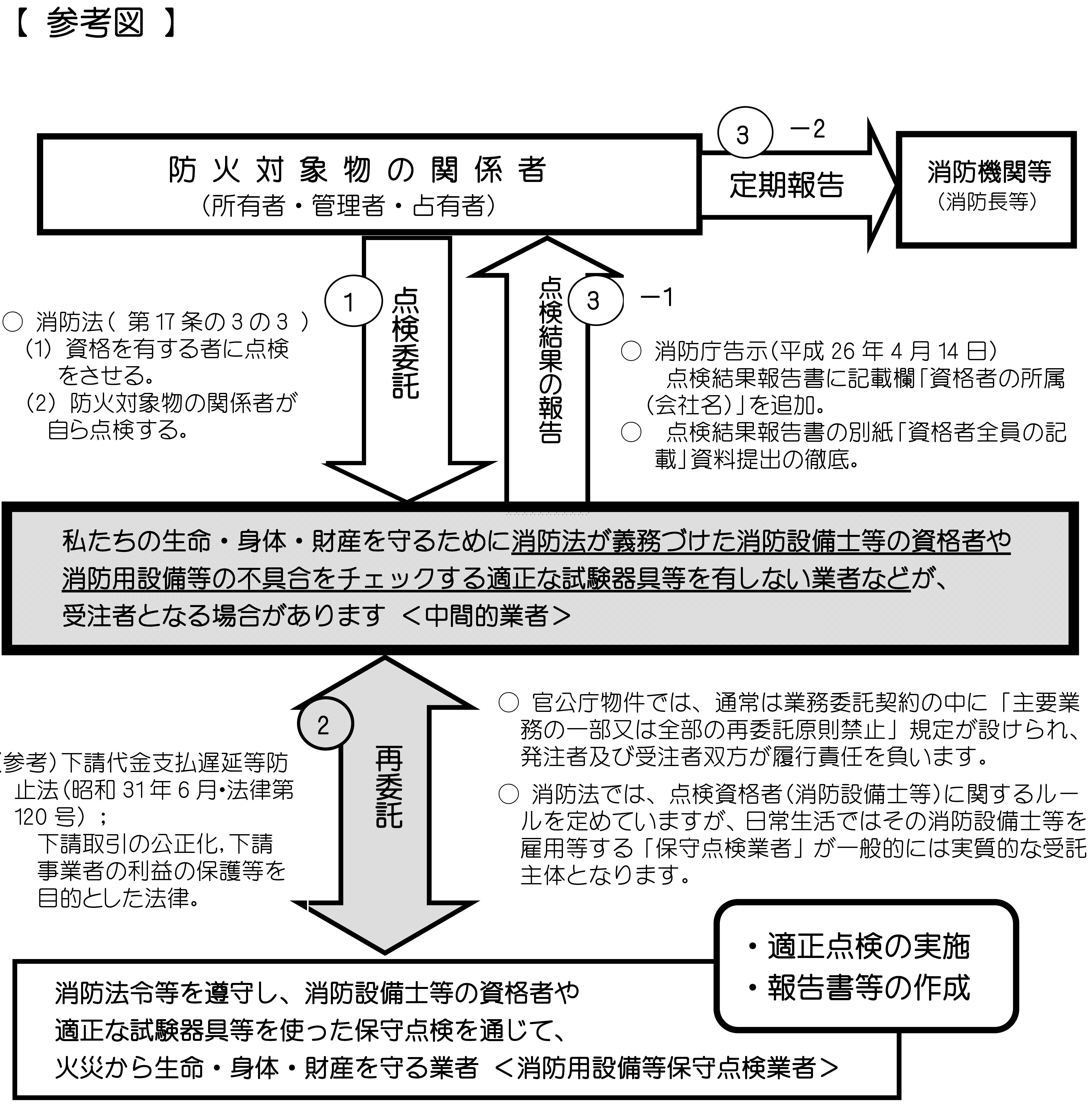 したがって、点検委託の実質的な受託主体は、消防設備士等の個人ではなく、保守点検業者(株式会社等)であると言うことができます。 |
